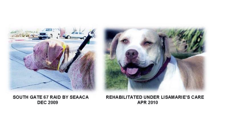 LISA MARIE: I received an urgent phone call from a woman in Canada who had been referred to me. She told me on the phone that she had no place else to turn, and that she had a dog she had boarded at Marc De Luna’s kennels, and she thought she recognized the dog on a movie clip of the South Gate Raid. Someone had told her Petey was dead, but if there was a chance he survived, I felt obligated to help get him out. I needed to know how he got in there, and where he originally came from: She told me she originally pulled him from death row in a Reno, Nevada shelter. After she had rescued him, she had no place to keep him – he was free without a place to be. She asked for advice from her LA rescue connections, where she was given Marc’s kennels as a good boarding facility so this is where Petey was checked into, but he was never checked out. Bark Avenue offered to temporarily care for some of the dogs to help Seaaca Downey shelter, where most of the dogs were taken who survived, and the owner of Bark confirmed Petey was not at her facility. So I went to Downey, after the lady from Canada agreed to send me everything I needed to go and officially free him, and have him in my care.