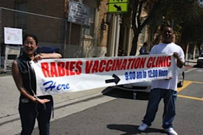 If the dogs didn’t show up, we had to go and get them, wake them up is what Dog Man said.  He did just that.  Volunteer Mike Parker and Dog Man took one of the banners that read, Rabies Clinic today 9-2:00, strapped it to Mike’s car and drove through Jordan Downs and Nickerson Gardens.  Dog Man got out of the car and started knocking on doors, basically waking people up to get dog owners to come out with their dogs to the clinic.  Back at the clinic, volunteers Keith and Olivia stood in the street, with the second banner stretched out, shouting out DOG CLINIC! to the passing cars.