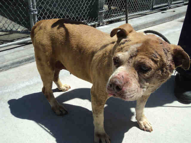 She was one of 21 dogs that came into to LA Animal Services as Evidence Dogs. When she was taken by the animal cruelty task force, she was badly injured, her body covered in bite wounds, presumably from being attacked by the other dogs. The owner signed her and the rest of the dogs in this pending case over to the Dept of Animal Services. Now they are all up for adoption. The other 20 dogs are being held at North East shelter.