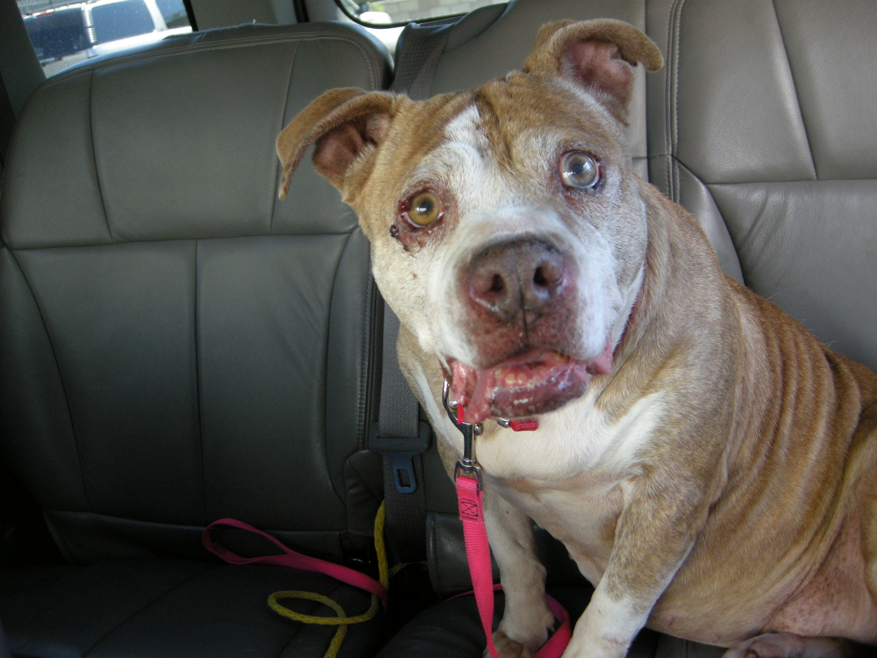 When Lori sent me the appeal about Lucille, it broke my heart. When I saw the picture of Lucille, my heart sank even lower. Lucille was at the shelter and she easily could be overlooked by potential adopters online just based on her picture not looking the greatest. She was a senior and she had wounds on her body. When word spread that Chela was actively networking her, I’m sure there was a collective sigh of relief among those of us who knew the reality of what happens to older and non-pretty dogs like Lucille at the shelter…below is part of an email sent by Lucille’s official rescuer, Chela the day she sprung Lucille out of permanent lock-up. Hooray CHELA! Hooray Lucille…look at those wonderful eyes…