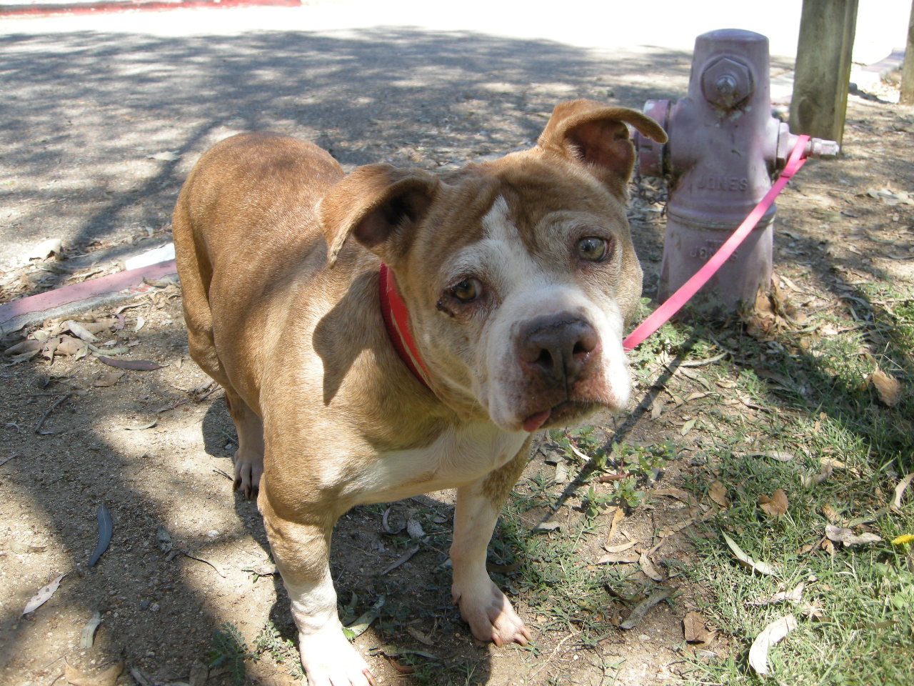 I just got home a few minutes ago with Lucille. She is a little chubby girl with no teeth. I stopped by Griffith Park on the way home to let her smell the grass and take a walk—I imagine it is the first time in a very long time, if ever, that she has done this. She has a lot of energy and I think some long walks with my boyfriend will trim some of the girth off her. She loves to walk and has a little tank like body.