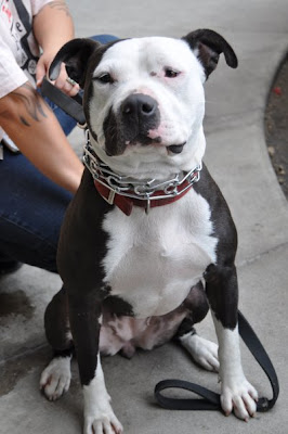 Amanda is 4-5 year old and is about 35 lbs. She is spayed and current on all vaccinations. She is a very petite and friendly pit bull terrier. She has had a very hard life. Her original owner, a taxi driver, lost his home, and he had no choice but to keep her in his taxi and drive her around with the passengers he picked up. This worked until someone complained to the cab company. He found a neighbor in Compton with a yard who already had 15 dogs on her property. This was ok for a few weeks until Animal Control mandated that she get rid of 12 dogs, Amanda being one of the dogs. Off she went to a poorly run kennel where she was warehoused in a tiny crate with hardly any food and dirty water. She was attacked by other dogs at this facility and as a result, suffered bite wounds to her face and muzzle. She is definitely not a fighter but had to fight for food and water at this kennel. But don’t worry, Amanda is sweet sweet sweet and she did not let this bad place change the lovely personality that she has. Animal Control began investigate the kennel and they were mandated to reduce their numbers; this is where Downtown Dog Rescue came in. Amanda was rescued because she had no chance of a good life if we didn’t take her. Emaciated, full of fleas, a bad eye that is still being treated, she is so grateful to have food, water, a blanket and a dog house every night to sleep in. Slowly, we are teaching her to walk on a leash and allowing her to enjoy her time with our dog pack. Please consider adopting or even fostering to adopt sweet Amanda who has been to hell and back.