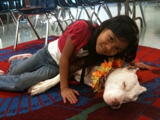 Many of the children picked to read to our dogs are at a low reading level, have low self-confidence, or have an unstable home life. All the kids want to read to the dog so just being picked for the program immediately makes the student feel better. The dogs is a calm, non-judgmental soft friend who does not laugh when the child makes a mistake. Even learning questions are based through the dog, “Princess, do you understand that word? It means…” Children read to the BARK dog 15 minutes, once per week for eight weeks. At the end of that time, they are given a bookmark with information about their BARK dog, a small stuffed dog, and a brand new book.