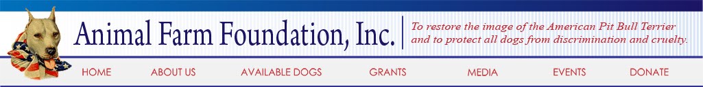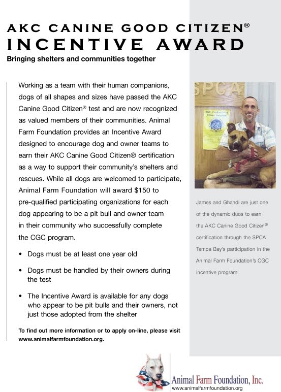 On behalf of Lori and DDR, we would both like to thank the Animal Farm Foundation for sponsoring DDR’s CGC trials (Canine Good Citizenship Test) for pit bulls). Their Incentive award program has really helped us reach out to new people in the community and have their beloved pits AKC certified!