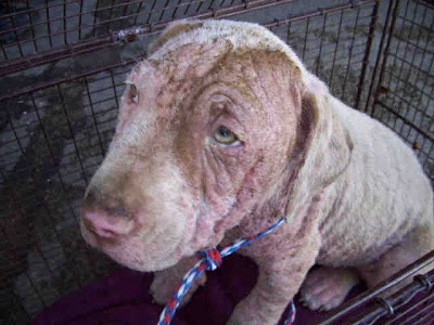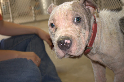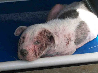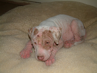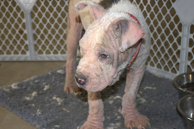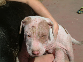 Here is the original ChipIn request from Candi Crawford requesting assistance with pulling, fostering + vet costs for two very cute pit bull puppies with very bad cases of Demodex mange. These were the pictures posted on Facebook.