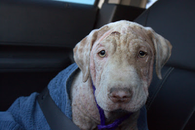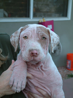 It was one week ago yesterday that I first discovered the photos of Tonka and Turtle on the OC Shelter website. Only having 24hrs to get the younger (Tonka) out seemed impossible, but THANKS to all of you who donated, a wonderful rescuer named Isabel, and a fabulous foster Suzy, it worked. I personally picked up Tonka and delivered him to Suzy a week ago today. He was scared at the shelter, came to me wrapped in a blanket, with little to no fur. He was not only nervous, but obviously in a lot of pain.