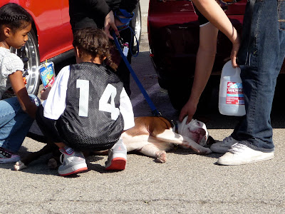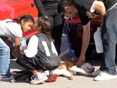 The clinics in the park are also a place where people often show up with sick dogs, dogs that they cannot keep, and of course, many stray dogs wander into the park. Foster Elementary teacher Laurie had her rescue dog spayed and now needs to find her a home. She found this tiny dog running on Rosecrans almost dead. Another client brought us a 5 week old pit bull puppy that looked as though he had been attacked in the eye by an adult dog. We took this puppy to a vet immediately and he is now in a foster home recovering.