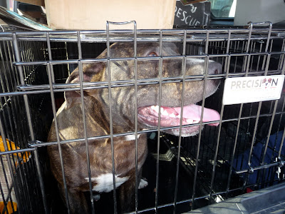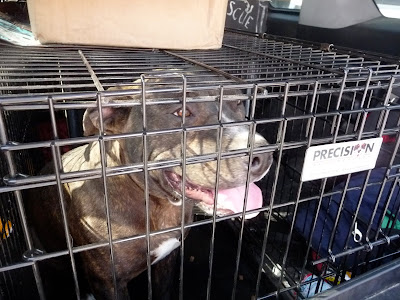 A young brindle male pit bull wasn’t as lucky. He was intently following a man past our clinic. He sure looked like the dog’s owner. He claimed that the dog didn’t belong to him. Debbie and I didn’t know what to do, so we gave him “The Clancy Test”. We put a collar and leash on the boy and I went to my car and brought out Clancy. The good news, he passed. He was social with Clancy and rolled around in the grass with him for about ten minutes. I loaded this boy up and Edgar named him “Askim”. He is now living at our kennel and is available for adoption after he is neutered next week.