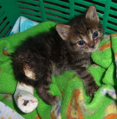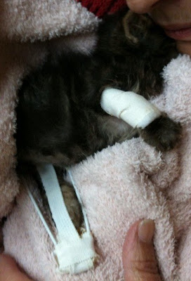 About a week ago, Long Beach Felines was contacted about a kitten with a deformed leg, but we did not have any room. About a week later, we again came into contact with the kitten who had finally gotten to a vet. The kitten (named Twister at the time) had an ankle out of joint and a fracture of his lower femur. His foster mom was about at her wit’s end so LB Felines decided it was in the kitten’s best interest for us to immediately made room from him. The kitten (now named Orion) has since undergone surgery to repair his femur at All Care in Fountain Valley at a cost of $2,500. His leg is currently in an external fixator which will be removed in a couple of weeks if all goes well. Long Beach Felines is a very small rescue with limited funding. Any help would be appreciated. We are a non-profit and a tax deduction receipt can be provided if requested.