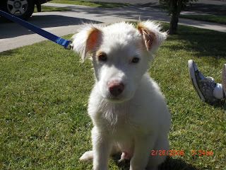After a bath, Yuki is feeling and looking much better! He is a gorgeous furry white lab mix with beautiful green eyes! Lori the teacher has already gotten him vaccinated. Currently, he is about 10 pounds, but will probably be a medium to large sized dog.