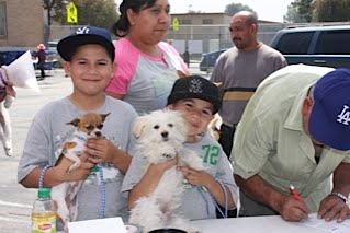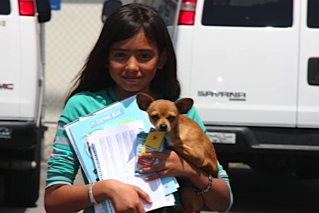 If the dogs didn’t show up, we had to go and get them, wake them up is what Dog Man said. He did just that. Volunteer Mike Parker and Dog Man took one of the banners that read, Rabies Clinic today 9-2:00, strapped it to Mike’s car and drove through Jordan Downs and Nickerson Gardens. Dog Man got out of the car and started knocking on doors, basically waking people up to get dog owners to come out with their dogs to the clinic. Back at the clinic, volunteers Keith and Olivia stood in the street, with the second banner stretched out, shouting out DOG CLINIC! to the passing cars.