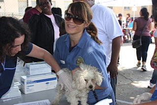 The challenge we faced yesterday was, do we turn the dog owners away who can’t pay the $20 or do I walk down to Chase at the corner of Compton and 103rd street and withdraw some cash? I went to the ATM and the dogs were licensed, since our goal was to get as many dogs as possible vaccinated, chipped and licensed. It’s not that the dog owners want everything free, they just don’t have the money to pay right now. One dog owner had $4, another told me that she could pay me back the $20 over the course of three months. $20 may not be a lot of money to me or you, but it’s a lot when one is living in Section 8, on SSI or GR or is homeless, living in the park, as one dog owner confided to a volunteer. For eight years she had lived with her Chihuahua in the park.