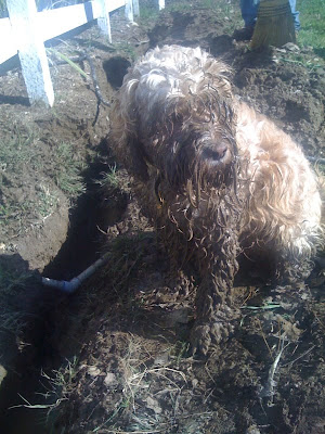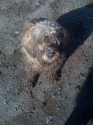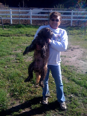 Everybody (and I mean EVERYBODY) loves him. I have tons of friends that would steal him in a heartbeat. He goes to the barn with me everyday and has a very full social life. He ignores the horses, knows to stay out of the arenas, and is very busy keeping an eye on me all day while greeting all the clients as they arrive to ride their horses. We are starting to obedience train him with the thought of maybe making him a therapy dog. He would be a great one (and it would keep Milt busy too).