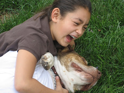 One of the most amazing things about Pirate is the relationship she has with my girls, Miya (10) and Ami (7). She helps bring peace in my house when my girls argue by somehow distracting one of them to spend time with her. She calms them down by sitting next to them and pawing at them or rolling on to her back, asking for a belly rub, or just sitting or laying at their feet while they sit on the front steps. My daughters and Pirate can be seen running to the river-walk near my house, where they take walks.